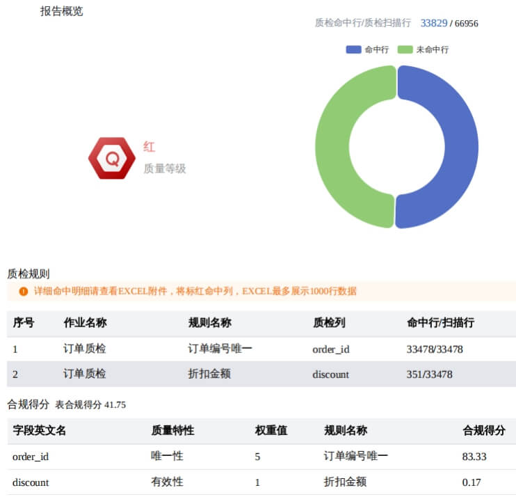 实时生成的质量报告,将校验规则、量化得分与 “红绿灯” 等级等关键信息直观整合,让数据质量状况从抽象指标转化为清晰可见的全局视图,无需复杂解读即可快速把握核心问题。